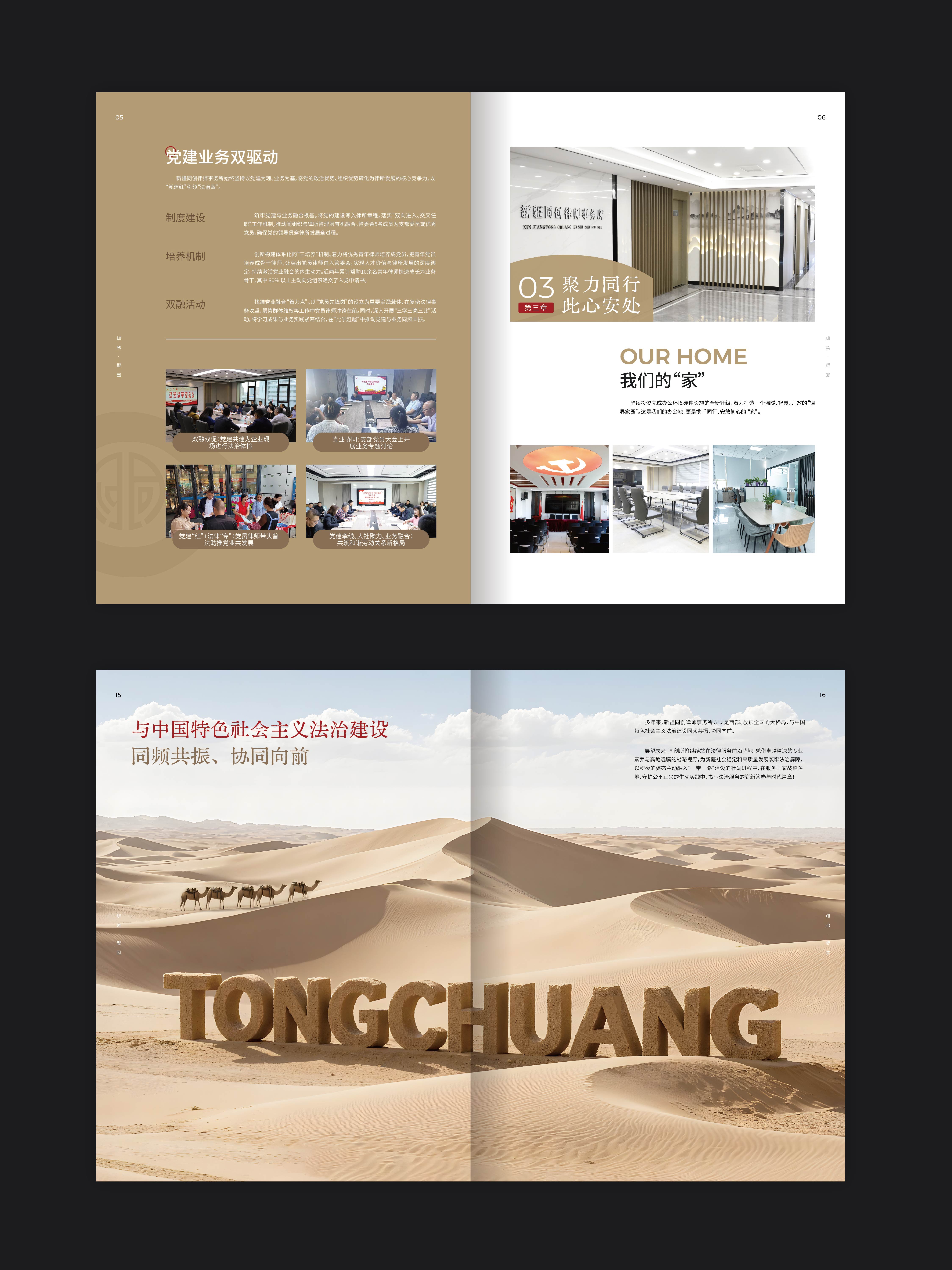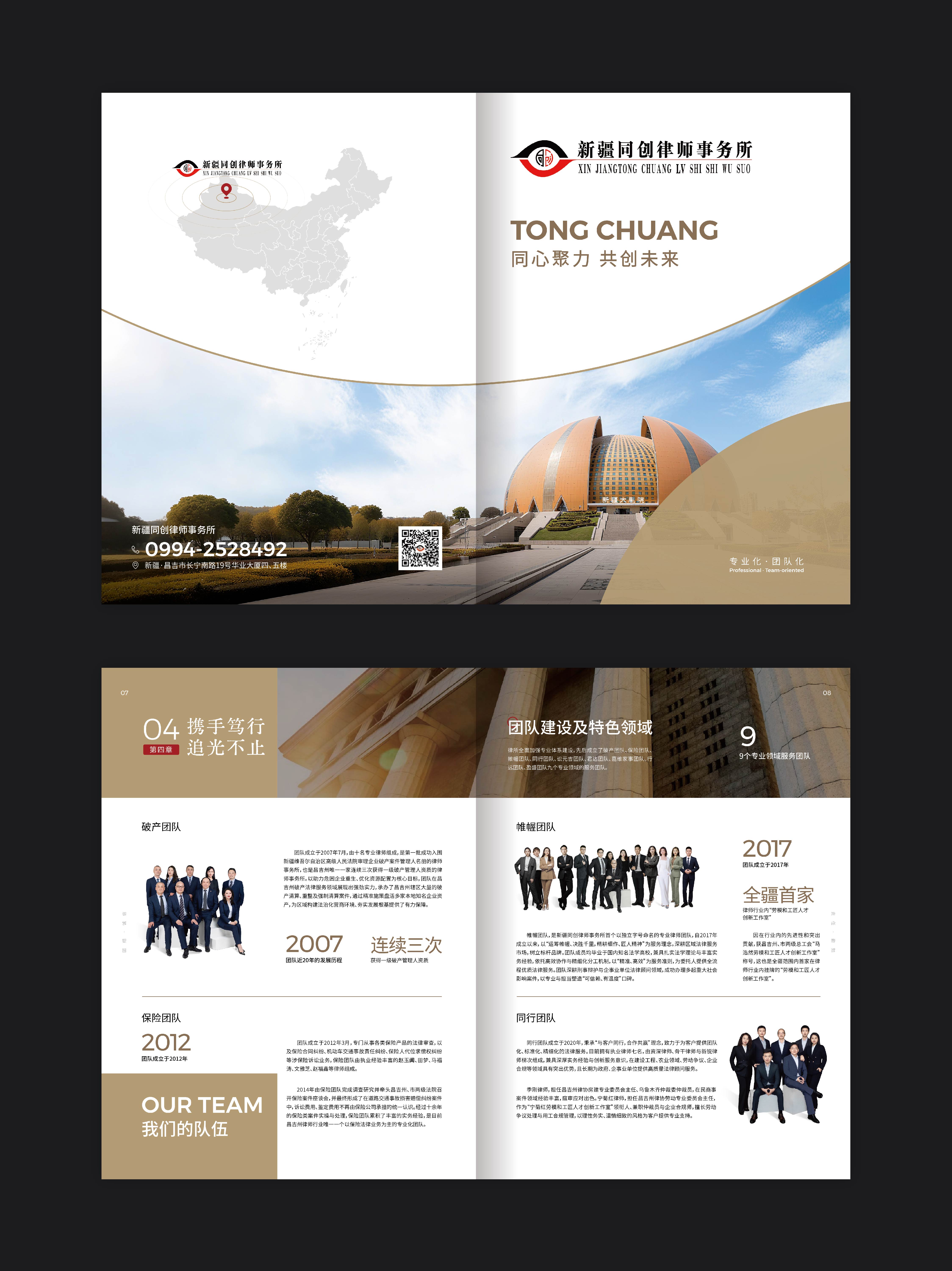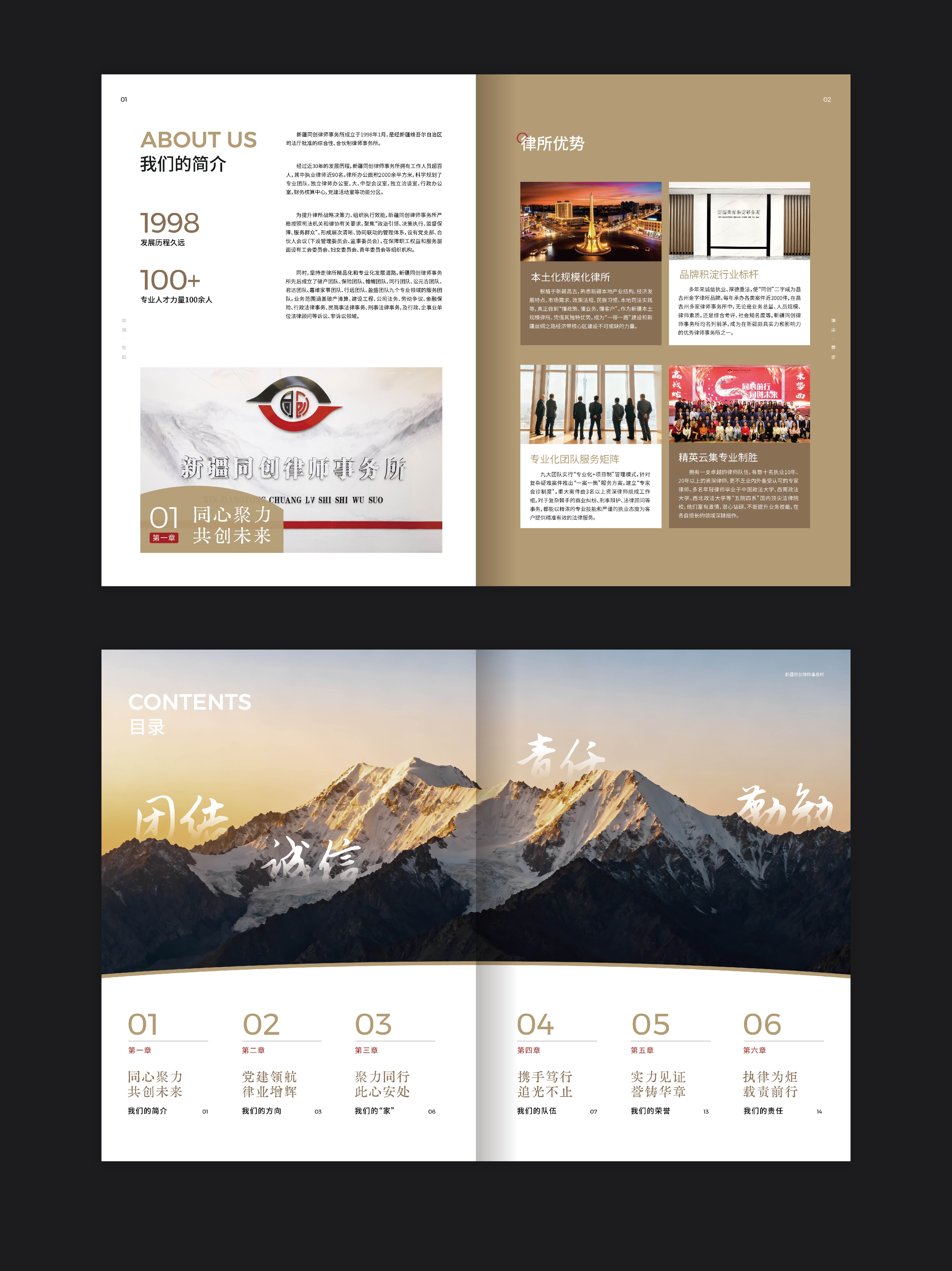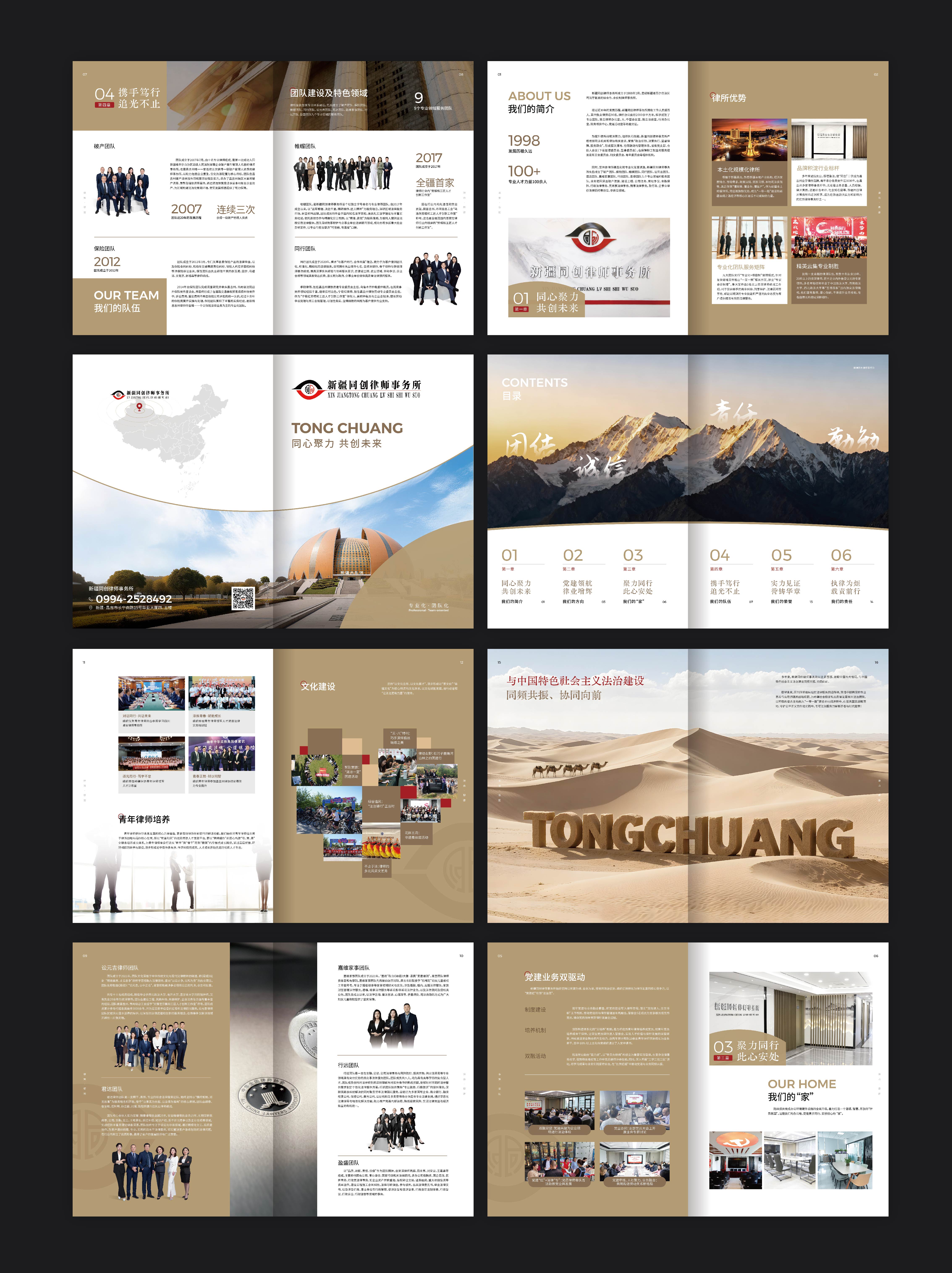 圭谷设计在新疆宣传册设计创作中,将九大团队的专业特色与经典案例进行可视化呈现。通过图文并茂的形式,让每一个团队的优势与成果跃然纸上:从政府机构的依法行政,到国企的合规运营,再到本土龙头企业的风险防控,近200余家顾问单位的选择,是对同创律所专业能力的最高认可。宣传册中,一张张团队协作的照片、一份份胜诉判决的剪影,不仅记录了律所的发展轨迹,更向社会传递着同创律所推动新疆法治化进程的坚定决心。